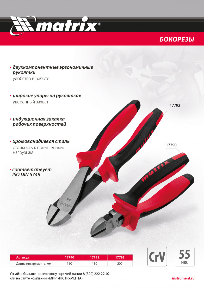 Бокорезы Matrix 17790 длиной 160 мм, из хромованадиевой стали, с двухкомпонентными рукоятками, предназначены для выполнения слесарных и ремонтно-монтажных работ: разрезания проводов, кабелей, стальной проволоки и гвоздей диаметром до 1,6 мм. Пригодятся в частной мастерской или на строительной площадке, будут полезны не только начинающему мастеру, но и профессионалу.