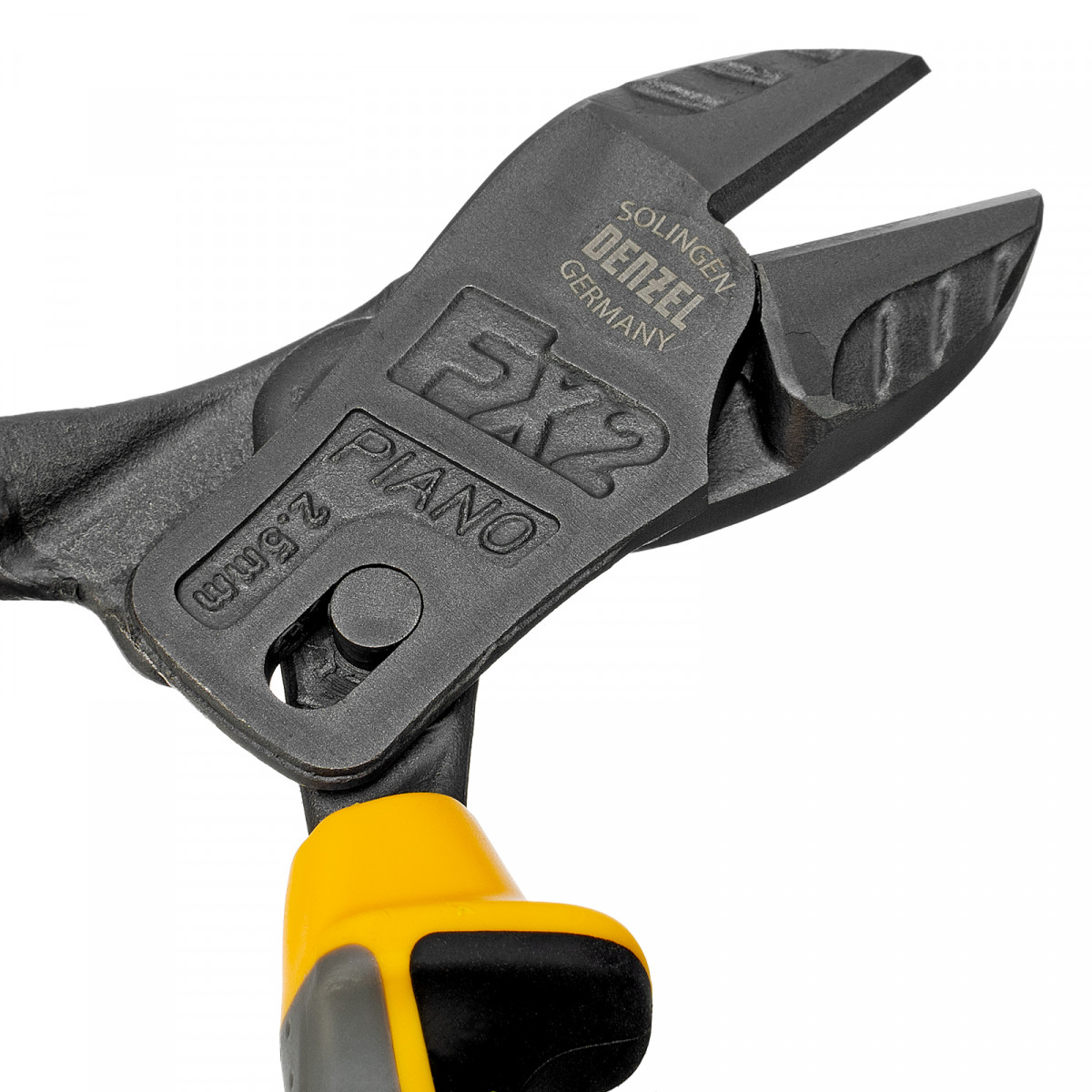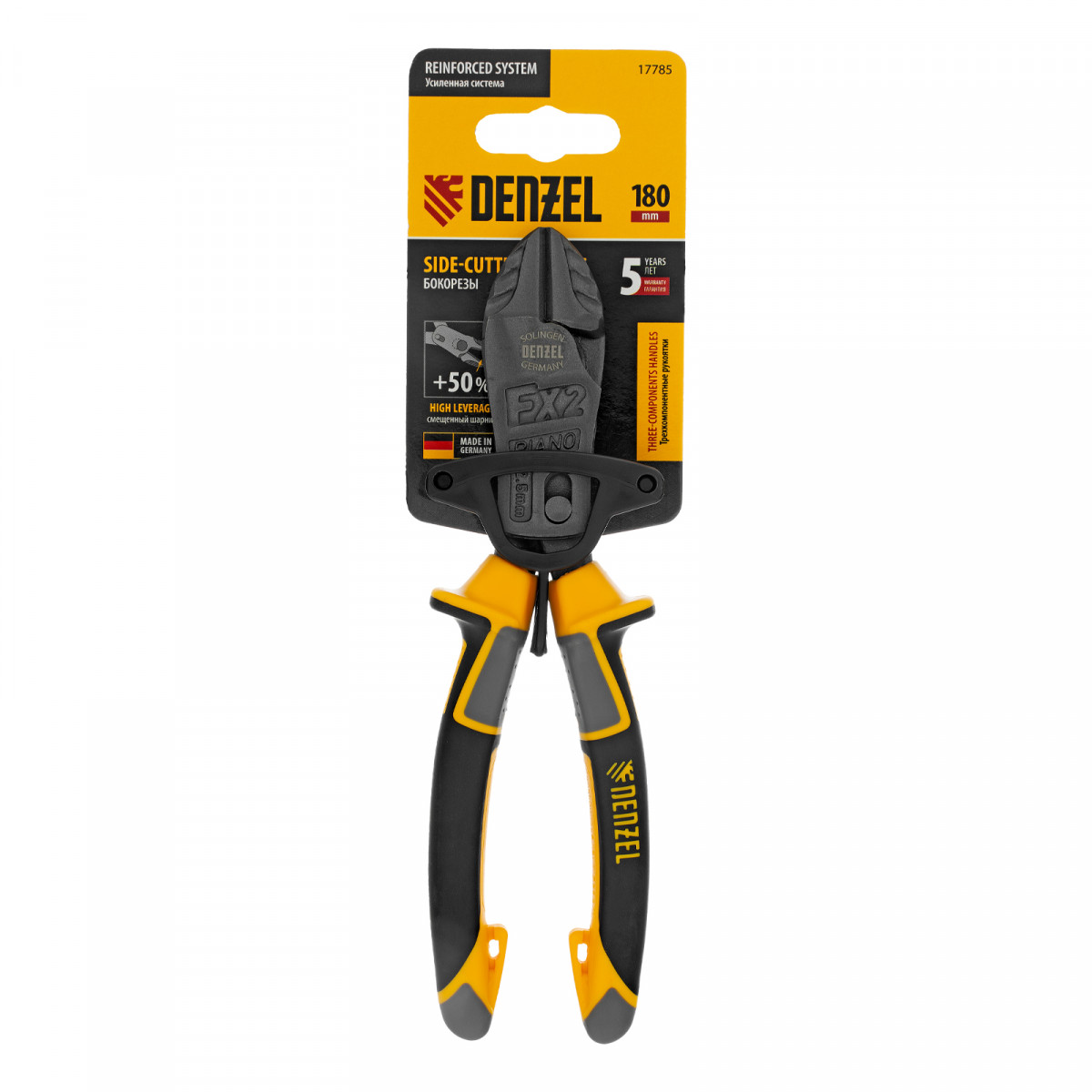 Усиленные бокорезы Denzel 17785 длиной 180 мм, с трехкомпонентными рукоятками, предназначены для разрезания кабелей, проводов, гвоздей и проволоки средней (750 Н/мм2) и высокой жесткости (1800 Н/мм2) диаметром 4 и 2,8 мм соответственно. Подходят для резки рояльных струн (предел прочности 2300 Н/мм2) диаметром до 2,5 мм. Успешно справляются не только с медными, алюминиевыми и пластмассовыми деталями, но и с более жесткими стальными элементами. Встроенный рычажный механизм и смещенный непосредственно к режущим кромкам шарнир увеличивают усилие реза на 50%.