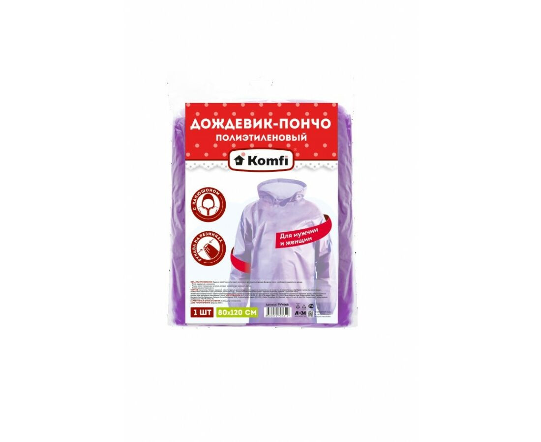Дождевик-пончо полиэтиленовый с рукавами, фиолетовый/зеленый Komfi/100