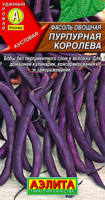 Фасоль овощная Пурпурная королева - это среднеспелый сорт, период от всходов до технической спелости 55-60 дней. Растения кустовые, низкорослые, не требующие опоры. Бобы длиной 15-17 см, шириной 1,0-1,3 см, в технической спелости без пергаментного слоя и волокна. Масса 100 бобов 450-600 г. Вкусовые качества продукции отличные. Рекомендуются для домашней кулинарии, консервирования и замораживания. Урожайность бобов в технической спелости – 1,6-3,0 кг/м2. Сорт устойчив к бактериозу, хорошо переносит засуху и пониженные температуры. Перед посевом семена замачивают в воде до набухания.