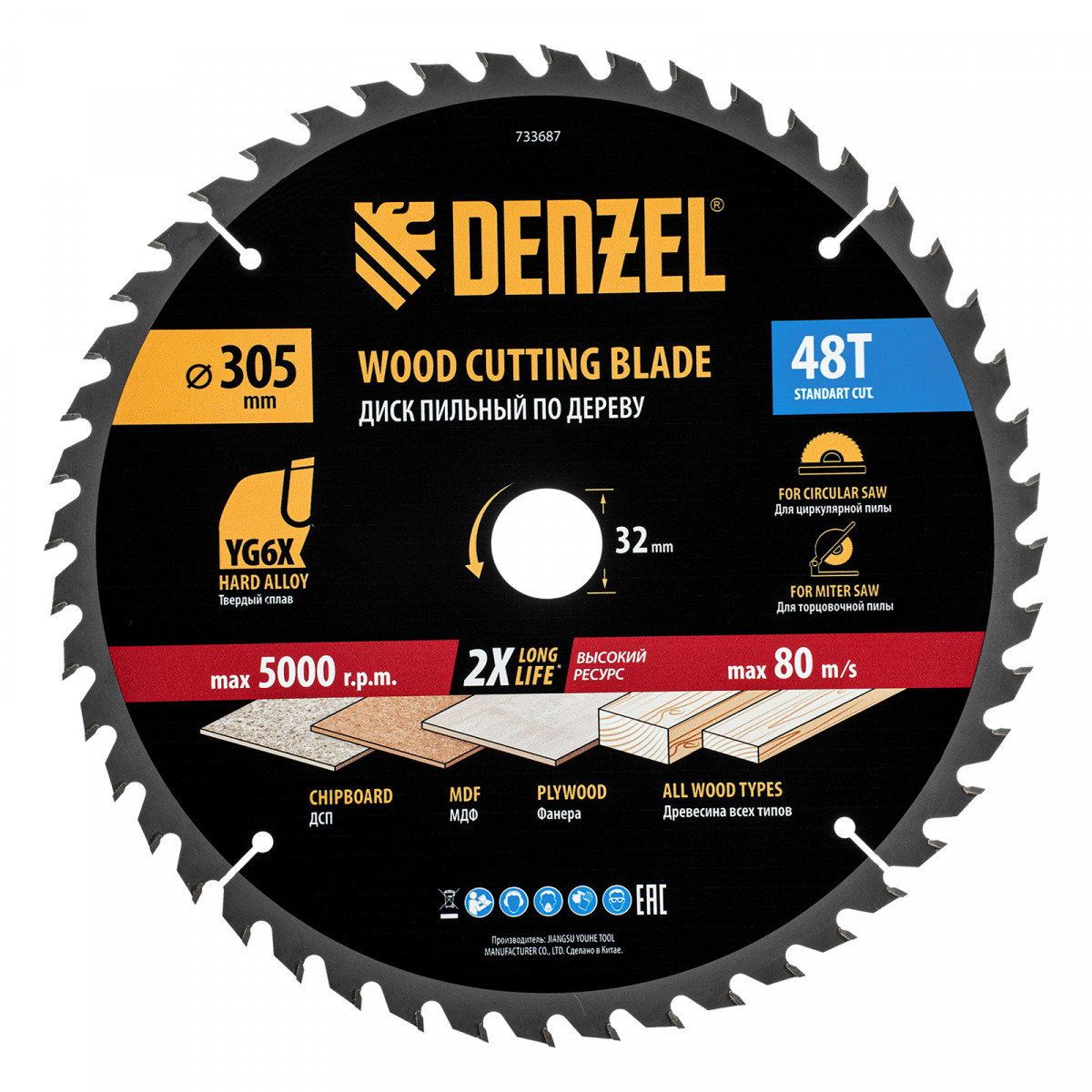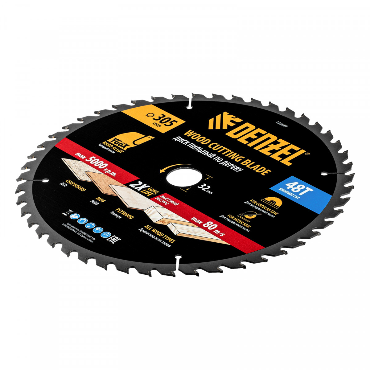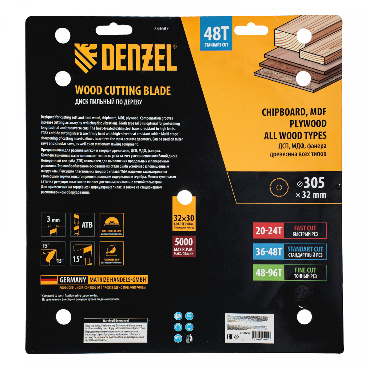 Пильный диск Denzel 733687 диаметром 305 x 32 мм, с 48 зубьями, предназначен для продольного и поперечного распила твердой и мягкой древесины, фанеры, МДФ, ДСП. 48 зубьев типа ATB с режущими пластинами оптимальной геометрии обеспечивают качественный рез. Тип реза — стандартный. Режущие пластины из твердого сплава YG6X сохраняют рабочие свойства при интенсивном использовании. Диск устанавливается на циркулярную, торцовочную пилу или на распиловочный станок. В комплект поставки входит переходное кольцо с 32 на 30 мм, что позволяет изменить посадочный размер и расширяет возможности использования диска.