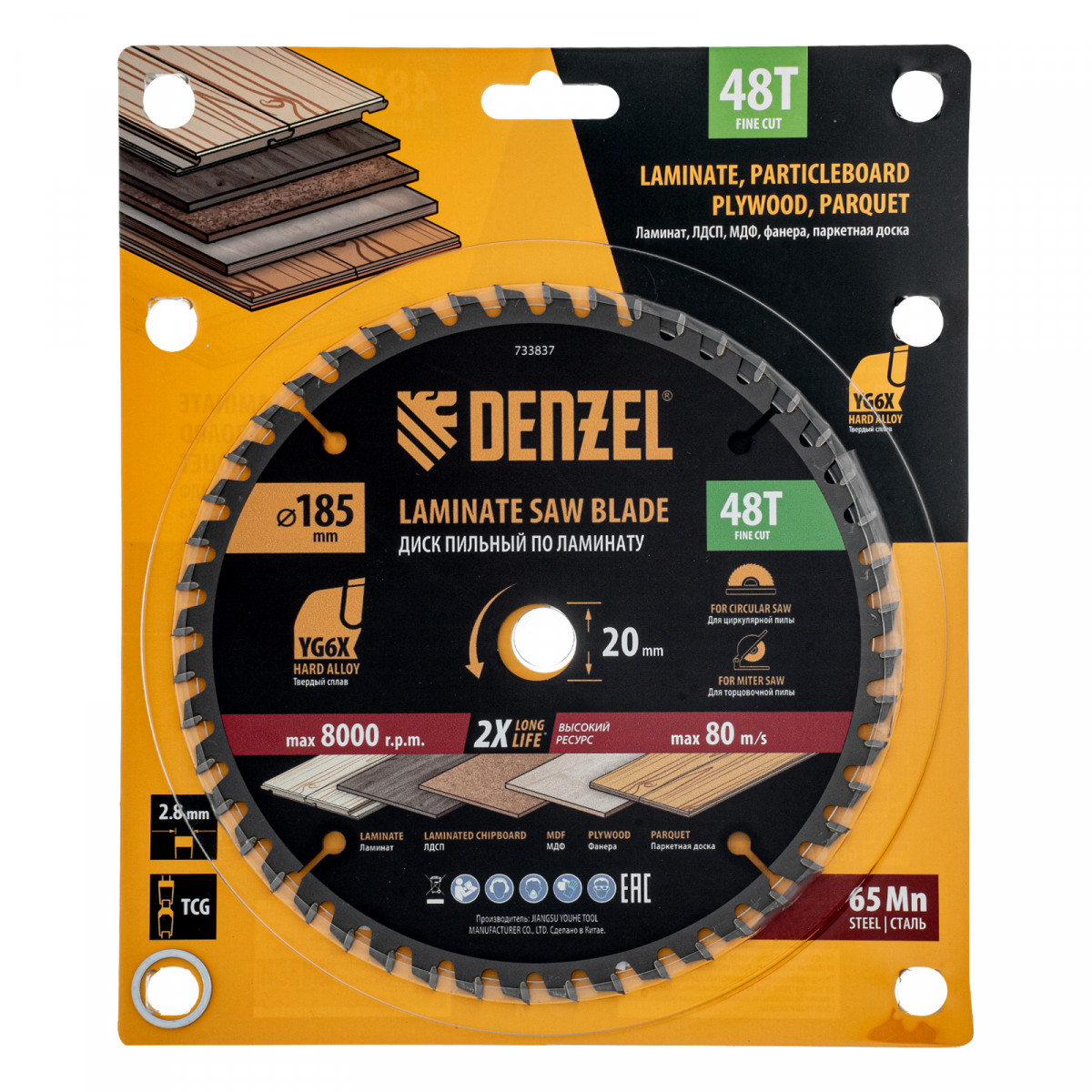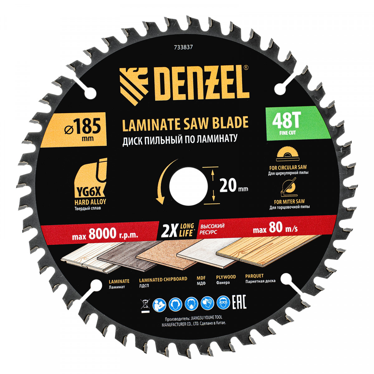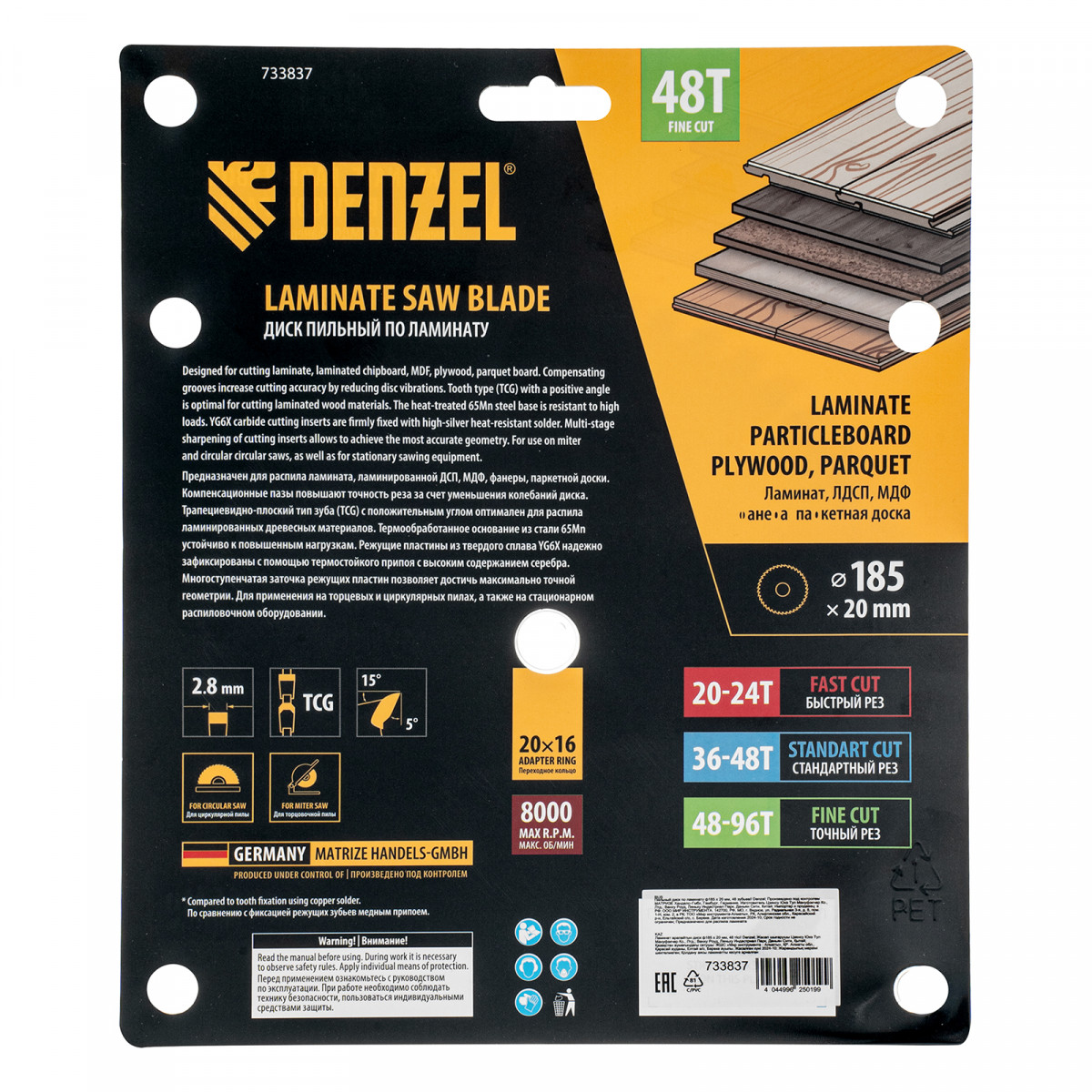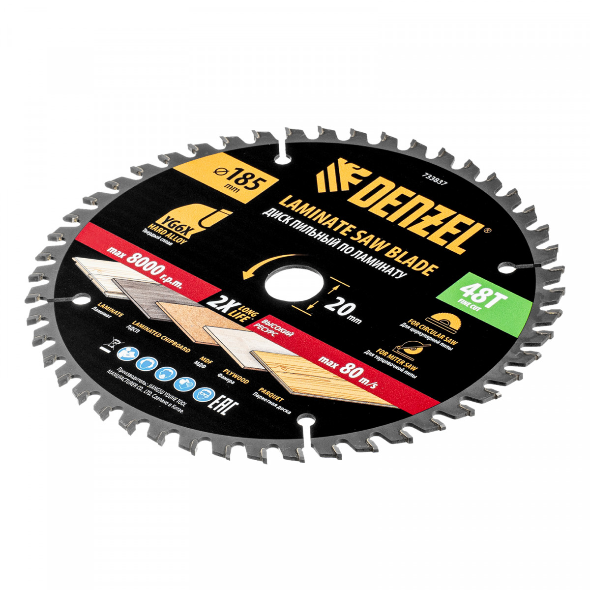 Пильный диск по ламинату ф185 х 20 мм, 48 зубьев Denzel