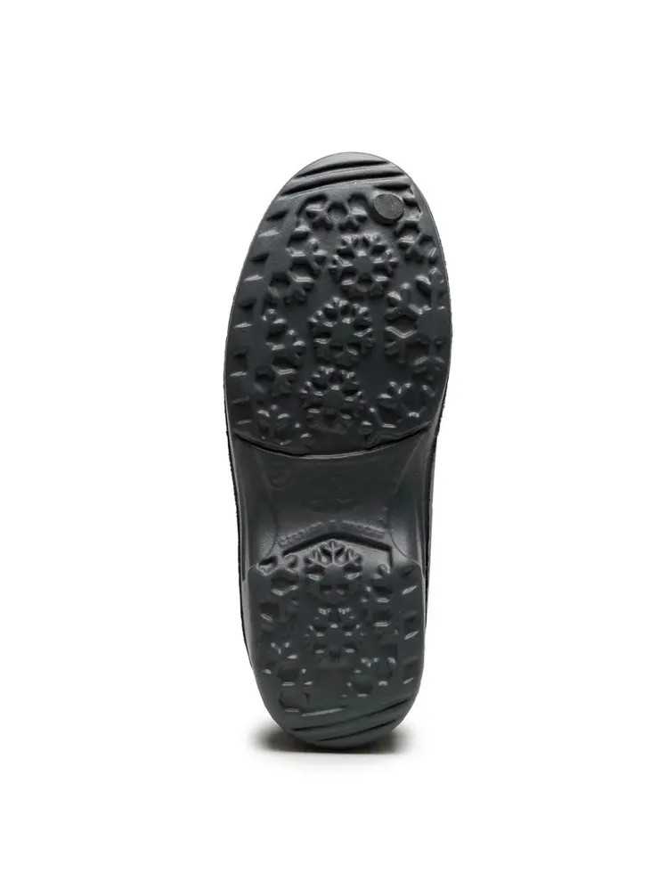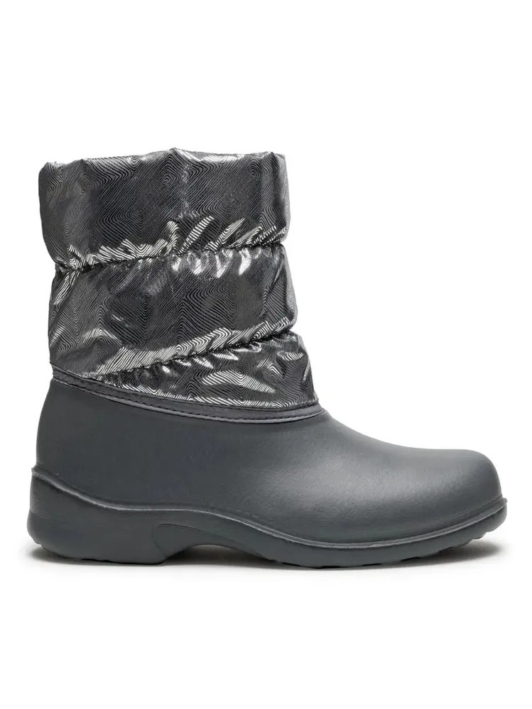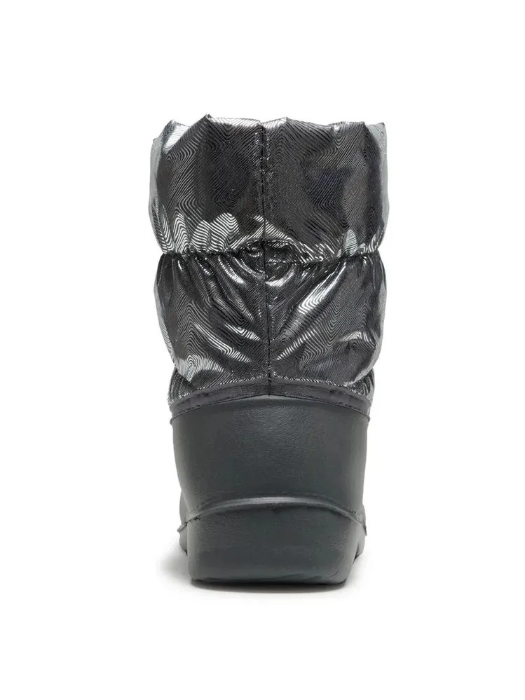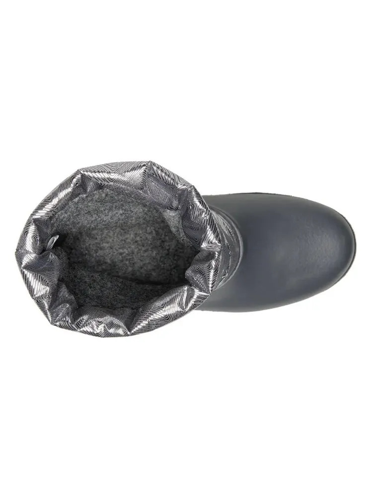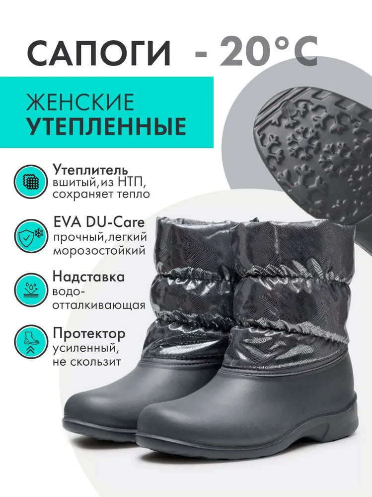Укороченные лёгкие женские зимние сноубутсы из морозостойкого полимера, утепленные дублированным нетканным ворсовым полотном для большего комфорта. Верх из декорированной фольгой ткани с водоотталкивающей пропиткой дублирован поролоном практичен в уходе. Объем верхней части сапога достаточен для комфортного обувания.