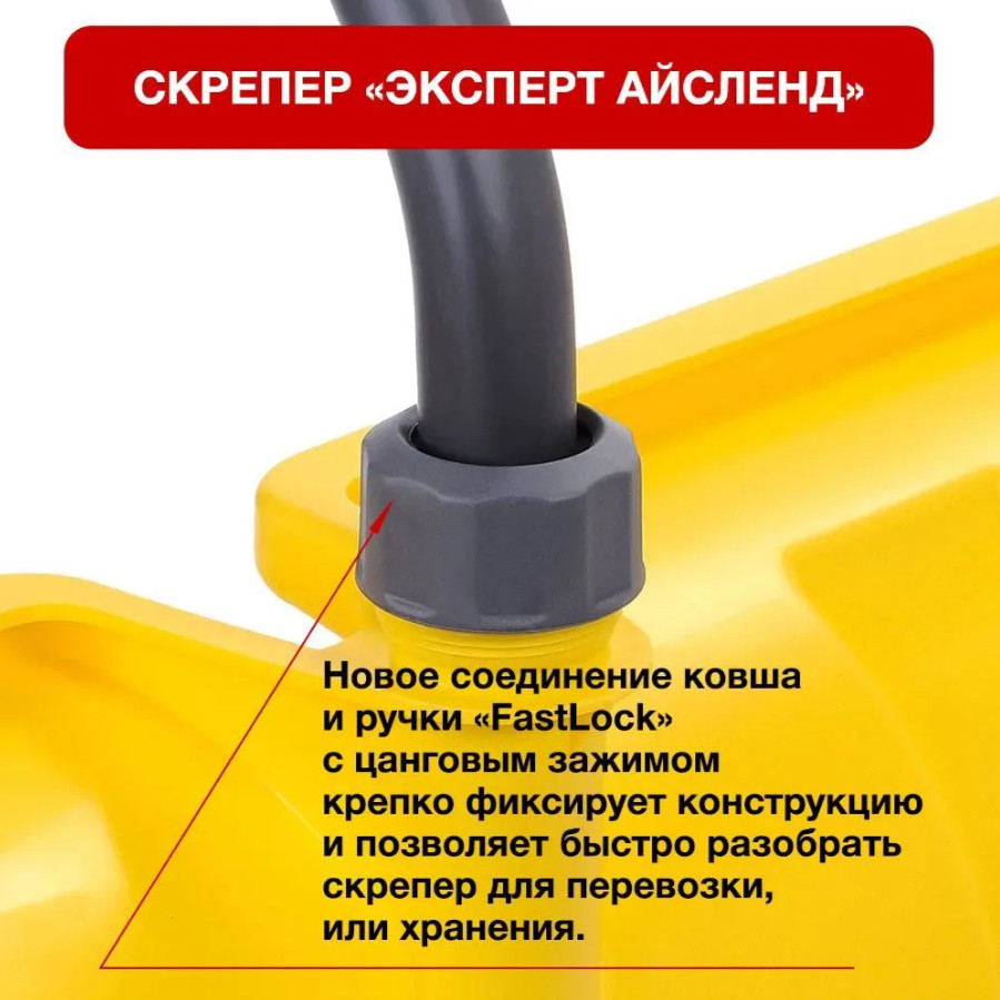 "Отличительная особенность снегового скрепера - идеальный угол наклона ковша и эргономичная форма ручки, которые снимают напряжение с мышц рук и спины во время работы. А предусмотренные конструкцией колесики обеспечат идеальное скольжение и сделают ежедневную работу приятной и комфортной. Ковш выполнен из европейского первичного ударопрочного материала с морозостойкими добавками, произведенного в соответствии с ГОСТ 26996-86,что позволяет обеспечить стабильное качество,безупречный внешний вид и гарантирует срок службы до 5 лет. Благодаря особым свойствам материала ковш получается глянцевым и гладким, поэтому мокрый снег будет с легкостью соскальзывать с ковша лопаты, что значительно облегчит Ваш труд. Новое соединение ковша и черенка FastLock с цанговым зажимом позволит собрать/разобрать скрепер одним движением для перевозки или хранения. Ваш ковш будет надежно защищен от механических повреждений за счёт алюминиевой планки, закрепленной прокатом.