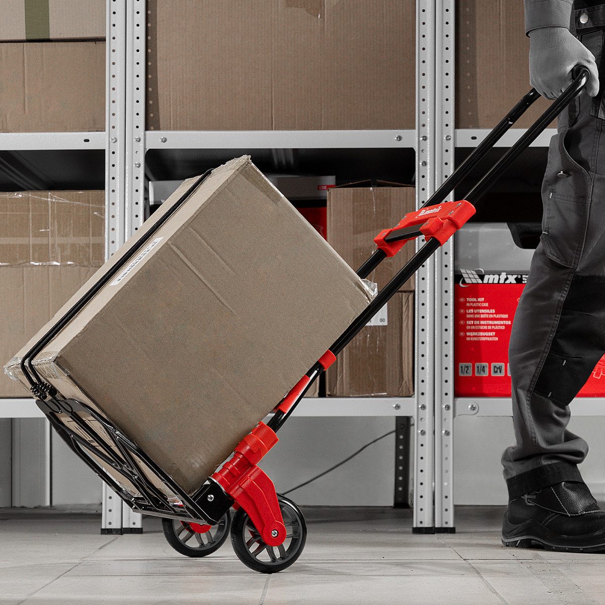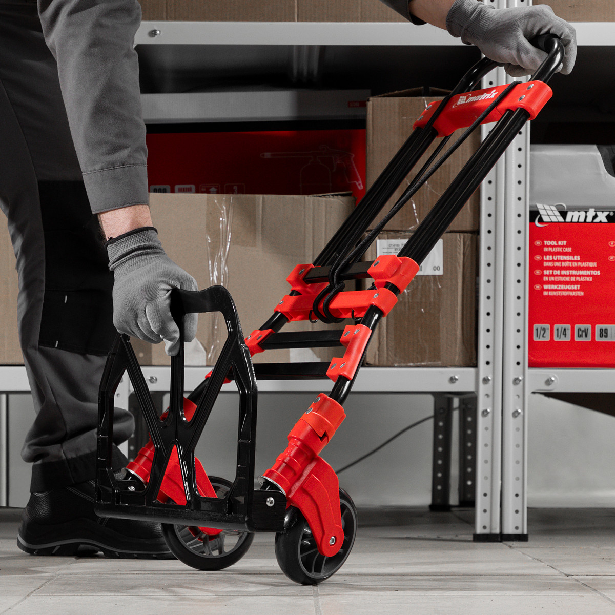 • Удобное хранение и транспортировка — платформа и колеса складываются, поэтому тележка не занимает много места.