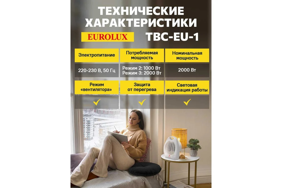 Eurolux TBC-EU-1 – модель электрического тепловентилятора мощностью 2000 Вт, с термозащитой, световой индикацией работы, терморегулятором, предназначенная для обогрева и вентилирования воздуха в помещениях площадью до 25 кв. м.