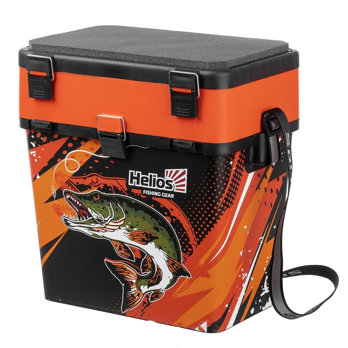 Ящик зимний рыболовный торговой марки Helios с индивидуальным дизайном с изображением щуки изготовлен из ударопрочного, морозостойкого и в то же время легкого пластика, обеспечивает надежное хранение и транспортировку рыболовных снастей.Рыболовный ящик выгодно отличается среди аналогичных ярким и современным дизайном. Вплавляемый этикет обладает хорошей устойчивостью к высоким и низким температурам, без проблем переносит контакт с водой, устойчив к истиранию и прочим механическим повреждениям.Благодаря объему 19 литров, ящик вместит очень много полезных снастей для рыбалки. Дополнительная проставка с 2 отсеками и съемными перегородками позволяет разместить небольшие удочки и другие снасти.Основной отсек предназначен для переноски рыболовных снастей, термоса, так же удобен для перевозки улова. На внутренней стороне крышки размещены 4 отделения с полупрозрачными крышечками для хранения мелких аксессуаров.Удобные и надежные замки гарантируют плотное прилегание крышки к основному отсеку ящика.