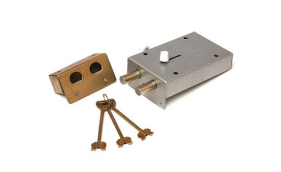 Замок гаражный, сейфового типа, накладной с задвижкой, 2 ригеля диаметром 17 мм, вылет 40 мм, 3 ключа.